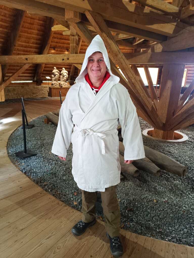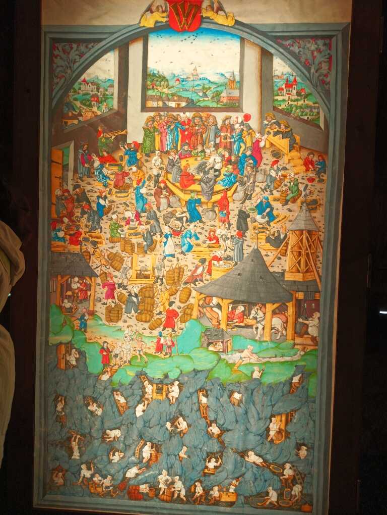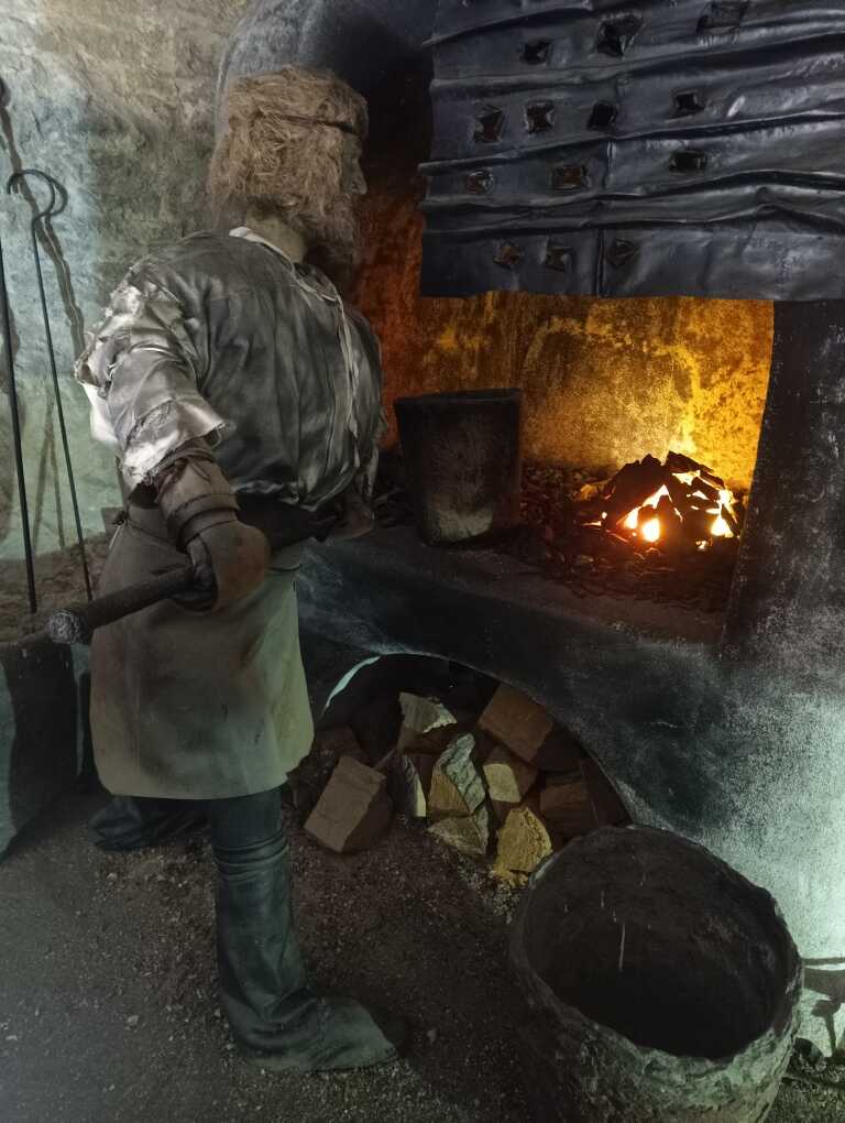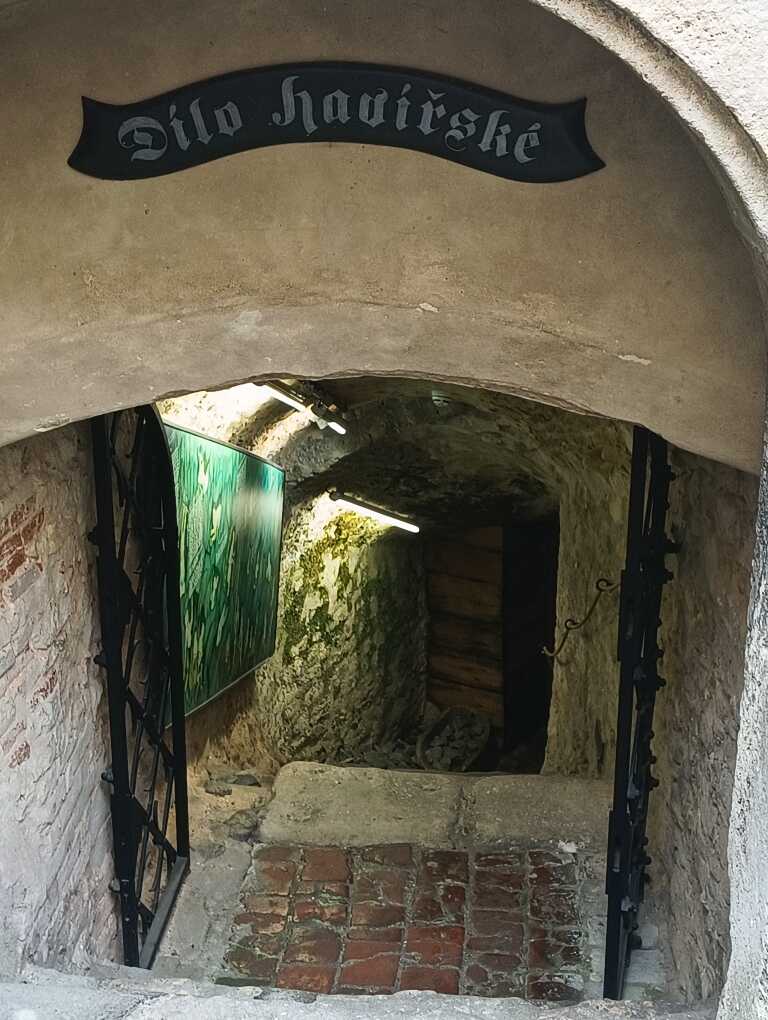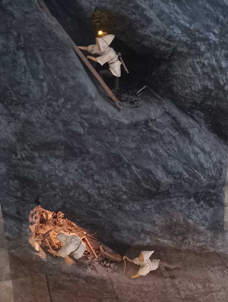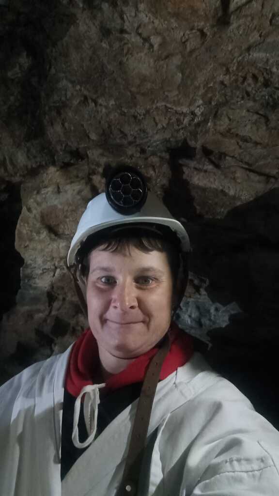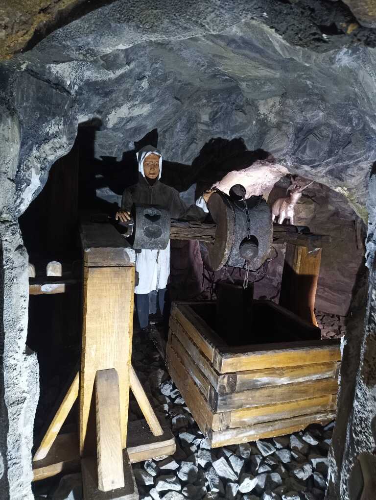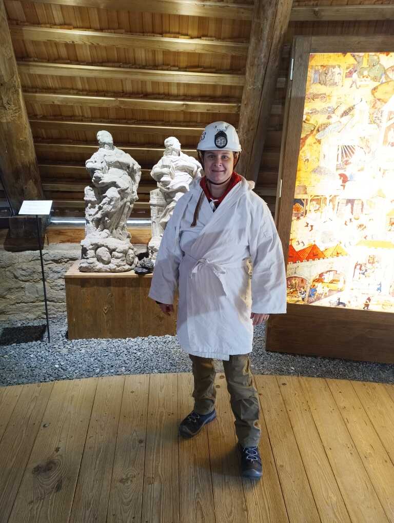 Tak tedy permoníci po nafasování bílé plátěné haleny - perkytli (tradiční hornický oděv) a helmy s čelovkou vyrazili na exkurzi do 250 m dlouhé štoly, kde jsme hřbet museli ohnout do výšky 120 cm a místy procházet bokem kvůli šířce štoly pouhých 40 cm. Proto se nedoporučuje vstupovat lidem s problémy s páteří, kyčlemi, koleny (160 kovových schodů dolů, 22 kamenných nahoru), klaustrofobií a po obědě vepřo, knedlo s osmi ...