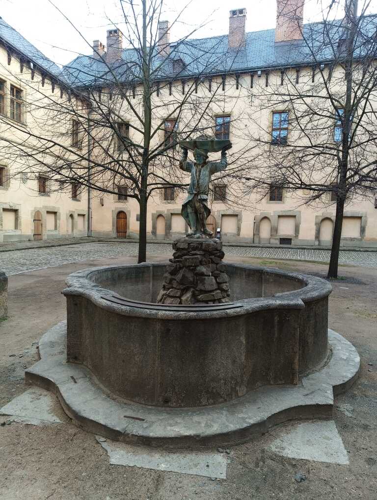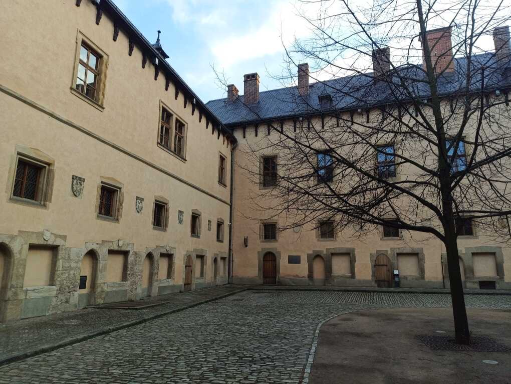 Z vnitřního nádvoří vedou původní, nyní zazděné portály vstupů, do osmi dílen (šmiten) královských horních měst. Každá šmitna byla označena tesaným městským znakem, z nichž se dochovalo šest fragmentů - jsou to znaky Litoměřic, Kladska, Jihlavy, Opavy, Mostu a Písku. Provoz mincovny byl zahájen roku 1300 a ukončen roku 1727. Vlašský dvůr je palác s několika síněmi, s honosnou domácí kaplí, pod níž je pokladnice s okovanými dveřmi a v kameni tesanou latinskou výstrahou, která v překladu zní: "Nedotýkej se mne!"