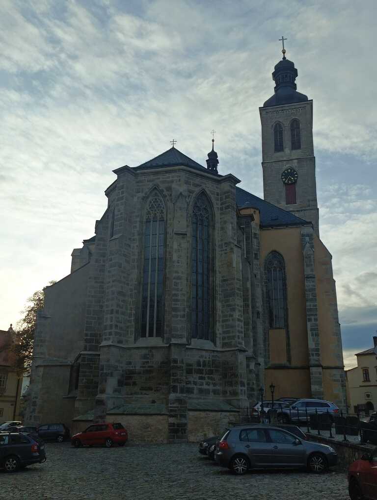 První fázi výstavby prováděla huť stavitele Svatovítské katedrály Petra Parléře, pravděpodobně pod vedením jeho syna Jana Parléře. Původně budované trojlodí bylo brzy rozšířeno o široké vnější lodi, avšak s příchodem husitských válek byla stavba poprvé na 60 let přerušena. Do té doby dosáhla téměř poloviny současné výšky, střední trojlodí však nebylo zaklenuto. Než stavba v roce 1547 získala klenbu, nebyla krytá proti dešti, což jí pochopitelně nesvědčilo. Práce byly znovu obnoveny v roce 1482, nejprve zde pracovali místní stavitelé, kteří pokračovali v intencích zakladatele stavby Parléře. Stavba byla budována z pískovce, získávaného z nedalekých dolů. Od roku 1489 až do své smrti roku 1506 pracoval na dostavbě kostela Matěj Rejsek. Ten dostavěl chór i bohatě utvářenou síťovou žebrovou klenbu a také část vnějšího opěrného systému. Mezi žebry jsou umístěny znaky cechů a erby měšťanů. Výška hlavní lodi je 30 metrů, délka 70 metrů a šířka 40 metrů.