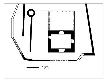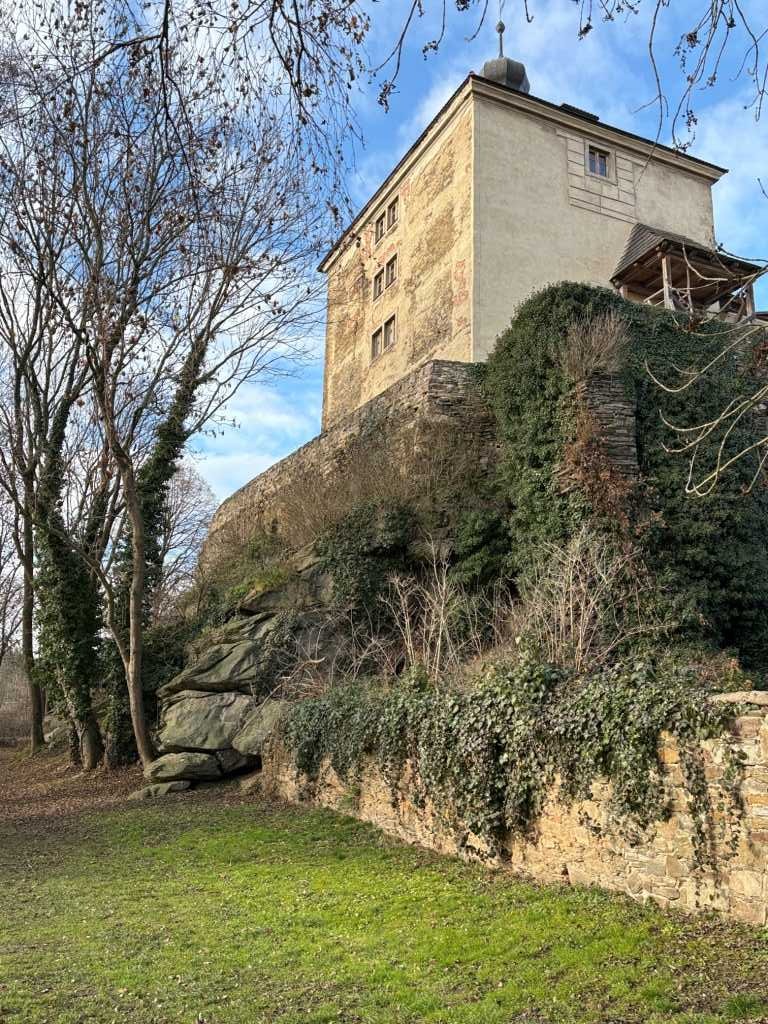 Tvrz byla vybudována na skalním výběžku. Skládala se z mohutné obytné věže o čtyřech patrech oddělených dřevěnými stropy. Vstup do věže byl z východní strany portálem v prvním podlaží přístupném po dřevěné pavlači. Na příkrých skalních stěnách okolo věže byly vystavěny parkány, na některých místech v různých výškách nad sebou, přístupné po dřevěných schodištích. Na severozápadním a jihozápadním rohu zdí byly kruhové věže. Menší severovýchodní obsahovala studni a větší jihozápadní obsahovala vězení. Tvrz byla rozdělena na část s obytnou věží a předhradí a ze severní strany, která byla jediná schůdná, oddělena vysekaným příkopem s dřevěným mostem. Z této doby je zachováno obvodové zdivo věže, gotické okno na východní straně věže a zdivo parkánů obklopujících věž.