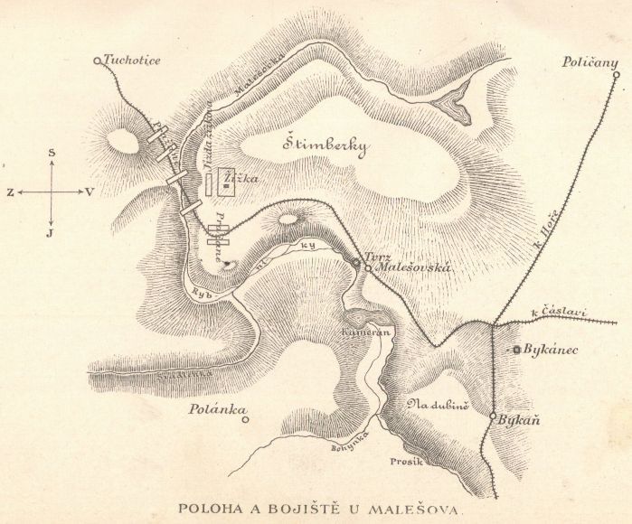 ... ˇŽižka pak táhl k Malešovu poblíž Kutné Hory a pražané stále šli za ním, když se spojili s některými pány a chtěli ho porazit. Žižka před nimi urychleně ustupoval, aby si někde našel příhodné místo k boji. Uchýlil se se svými vozy na jeden kopec, tam se opevnil a čekal na pražany, kteří ho pronásledovali a říkali, že už před nimi utíká. Ani nečekali, až se shromáždí všichni, a táhli přes to údolí, kde na ně Žižka čekal. Žižka se připravil k boji a postupoval takto: vozy srazil k sobě a seřadil houfy; nejprve jezdce, pak i pěší. Potom vybral několik pícních vozů a přikázal je naplnit kamením, a ty postavil doprostřed houfu mezi jezdce tak, aby je nepřátelé nezpozorovali. Pak pustil polovinu pražanů přes to údolí a poslal na ně své jezdce. Pěší uprostřed mezi jezdci tlačil ty vozy. A když už se k nim přiblížili, přikázal pustit na ně shora ty vozy a tak jejich šiky úplně rozbil. Potom dal na ně střílet z děl a svým lidem přikázal, aby na ně udeřili. Pražané, když jim jejich šiky nebyly nic platné, se obrátili na útěk a cestou strhávali sebou ty, kteří táhli za nimi a tak utíkali všichni ...
