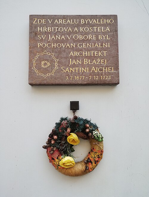 Jan Blažej Santini-Aichel zemřel po delší nemoci 7. prosince 1723 v Praze a byl pochován dle posledního přání na dnes již zrušeném hřbitově u bývalého kostela sv. Jana Křtitele v Oboře v dnešní Šporkově ulici.